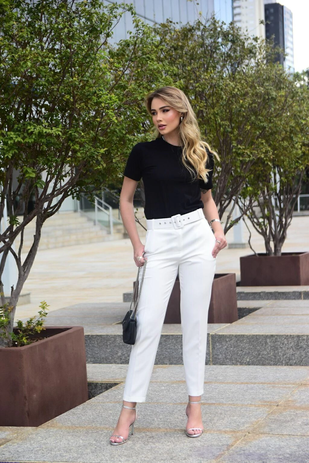 Como Usar: Combine com blusas de seda ou camisetas básicas para um look que transita entre o casual e o formal. Adicione a Calça Alfaiataria Com Cinto ao seu guarda-roupa e sinta a elegância em cada passo!