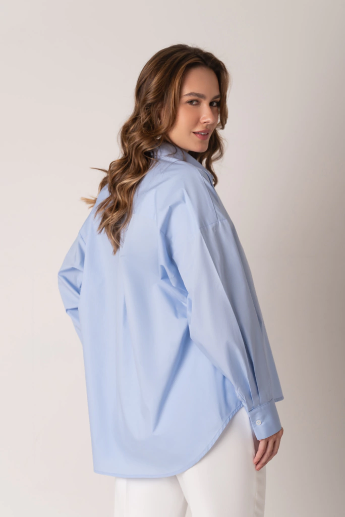 Camisa Oversized Flow Baby Blue: a escolha perfeita para quem busca uma peça que une conforto, estilo e versatilidade. Confeccionada em tricoline 100% algodão, esta camisa oferece um toque suave e respirável, ideal para o dia a dia.